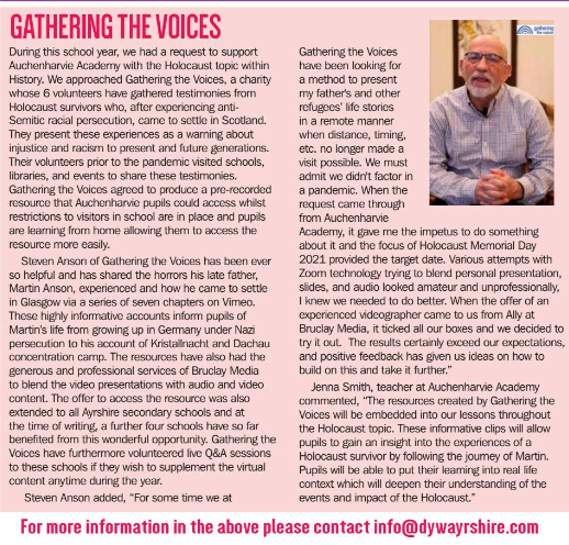 During the school year, we had a request to support Auchenharvie Academy with the Holocaust topic within History. We approached Gathering the Voices, a charity whose 6 volunteers have gather testimonies from Holocaust survivors who, after experiencing Anti-Semitic racial persecution, came to settle in Scotland.