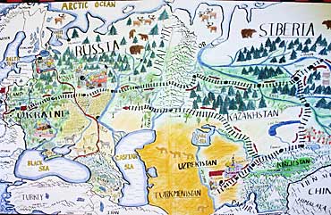 M: Well we were just floating down the river with the current ’til we got to the station Asino. I can show it to you on the map. Now I’m trying to see the River Chulym I’m looking for. Now Tomsk, that’s right and the River Chulym must be somewhere here. Kuznetski? It’s Asino! There you are Asino. So Tomsk was like, the nearest big town, there is Asino and that’s the River Chulym you see.