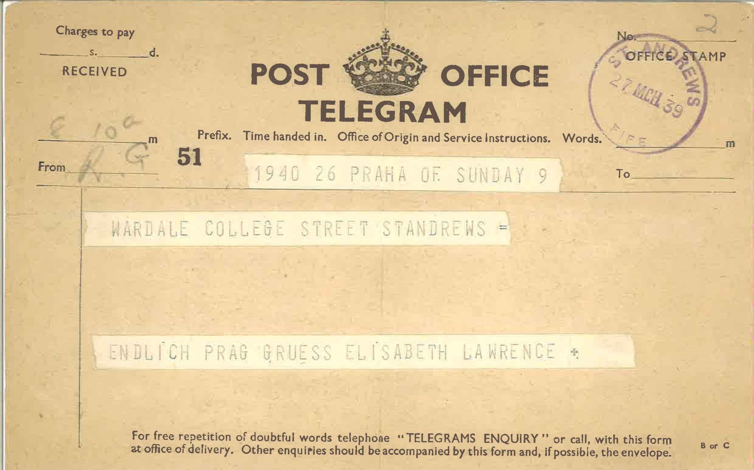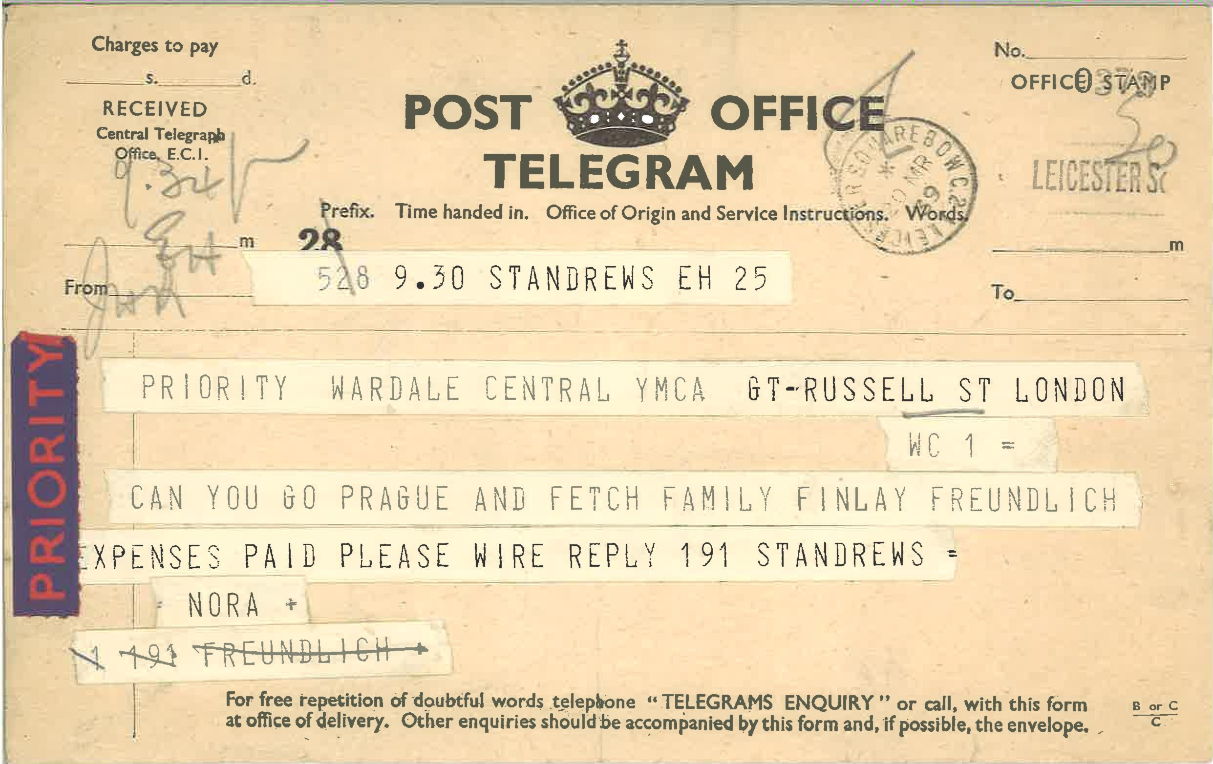 The first one is, “Can you go Prague and fetch Family Freundlich, expenses paid. Please wire.” This one is dated St Andrews, 27th March: “Endlich Prague” – Finally arrived in Prague – after several flights and train journeys and crossing borders. I even have his passport, Lawrie’s passport.